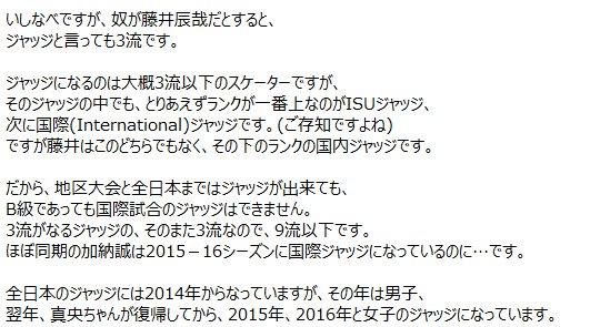 >今ジャッジやってる人が、今のトップ選手より技術がないのは仕方ないと思うのよ。その時代を経て今日までの発展があるのだし。信夫先生だって四回転跳んでた訳じゃないけど技術指導できてる。それと同じ。ただジャッジになったら、選手の頃のプライドを引きずった嫉妬心は完全に捨ててくれってだけ。