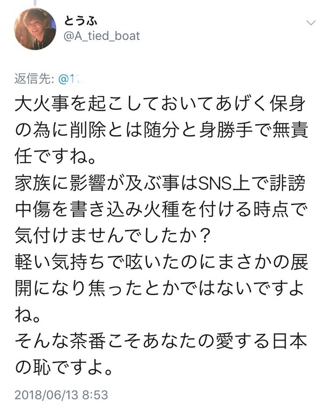 別の方も、ツイを削除されてました。家族を危険にさらすって、もう一般人のレベルじゃないですよね。立派な脅迫罪ですよね。恐すぎです。