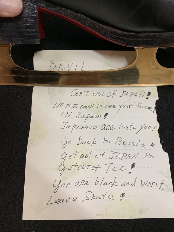 「重要」と言葉で切り出し、「私たちのスケート仲間の一人が今日、“ファン”からこのメッセージを受け取りました」と選手が受け取ったメモを撮影した写真を添えて報告。メモには「日本から出ていけ。日本人全てがお前を嫌っている。ロシアに帰れ」と書かれていた。